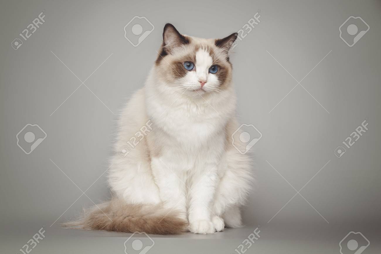 Fluffy Belle Chat Blanc Ragdoll Avec Les Yeux Bleus Posant Alors Qu 39 Il était Assis Sur Fond Gris