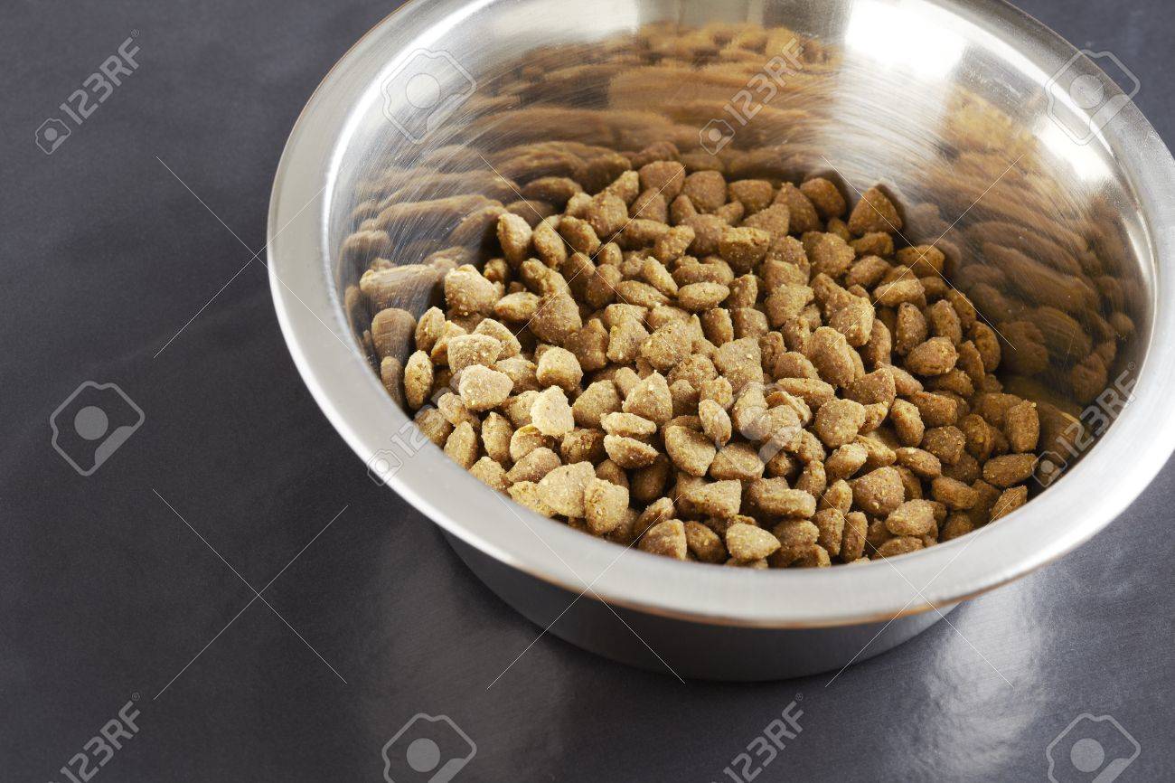 Chien Croquettes Ou La Nourriture Pour Chat De Près Dans Un Bol En Acier Inoxydable